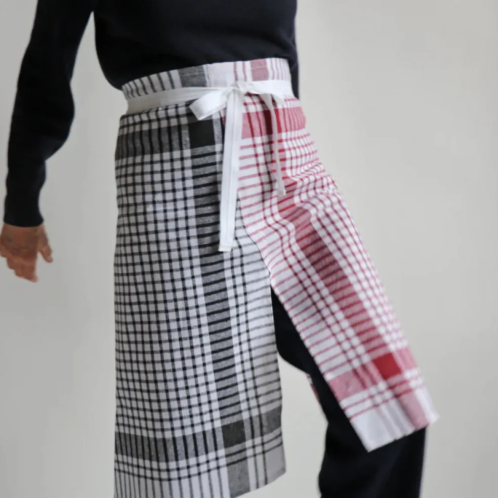 Un tablier dit de « cafetier », qui se noue autour de la taille et protège des hanches aux genoux. Il est upcyclé à partir de toiles de coton à carreaux chinées par l’atelier français Ensemble Créations.