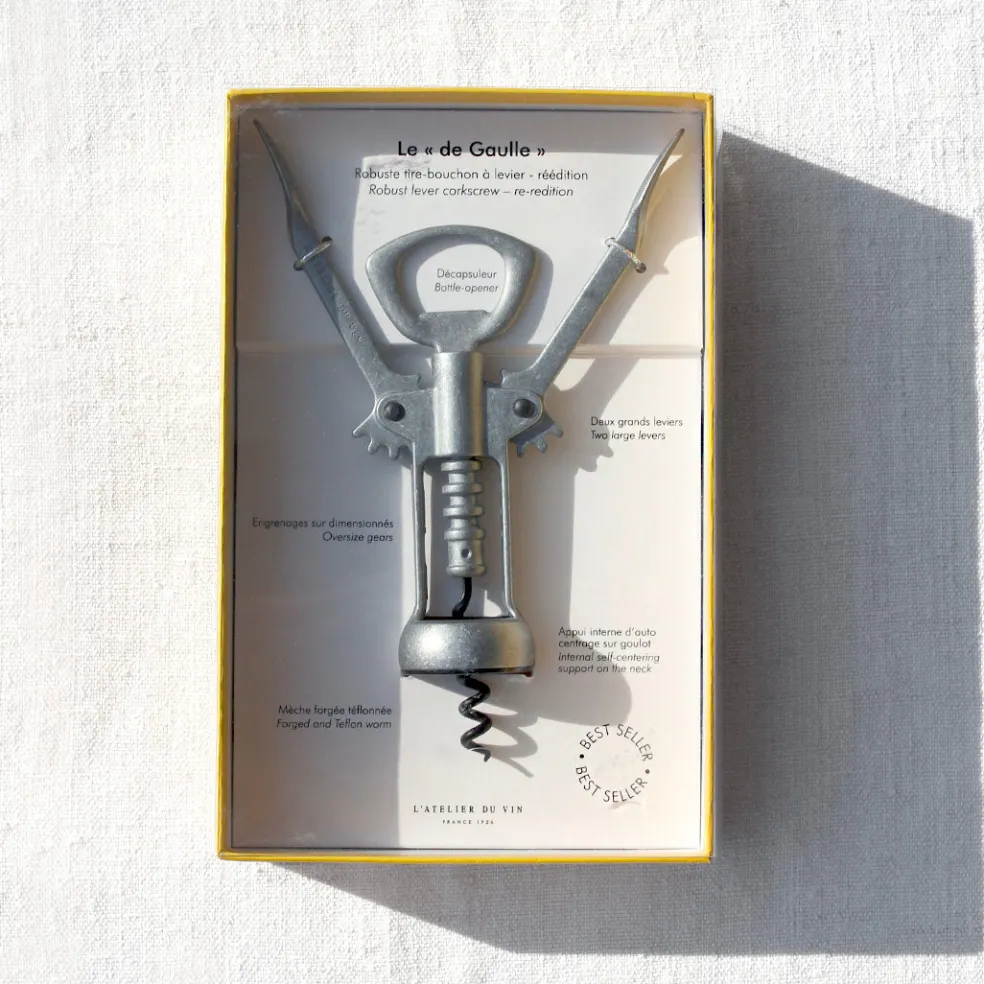 Un tire-bouchon traditionnel avec une mèche en « queue de cochon » forgée et un embout décapsuleur. Son système de double levier, comme deux bras levés en l’air, lui vaut le surnom du tire-bouchon de Gaulle.