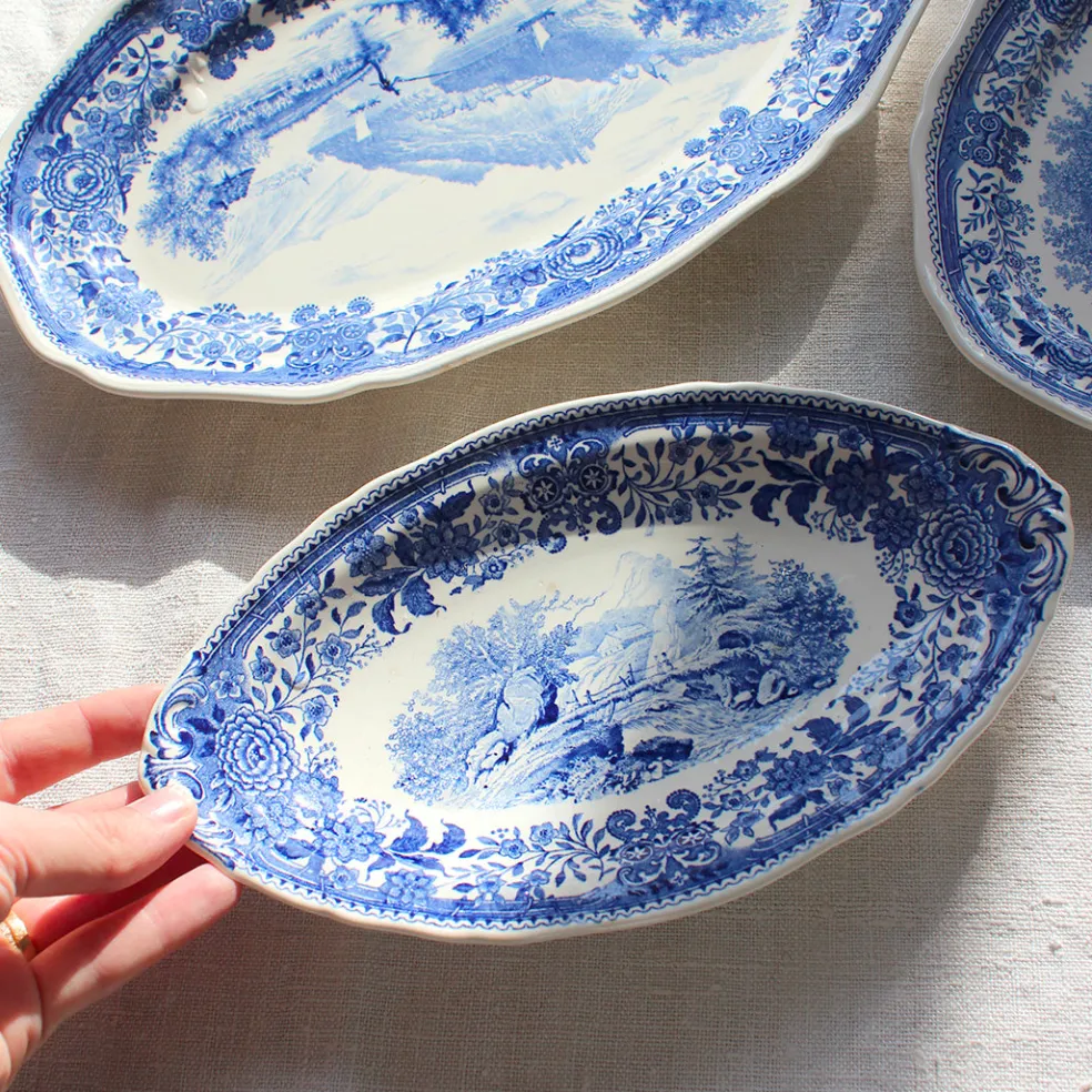 Fameux modèle Burgenland de la manufacture Villeroy and Boch pour ce trio de plats au format ovale. Au centre un décor de ruines et de châteaux d’un bleu profond.