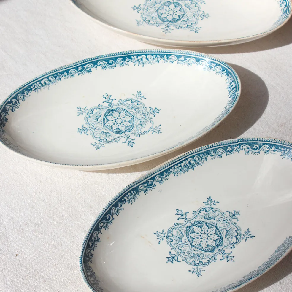 Raviers anciens au décor bleu encre en terre de fer. Un joli trio pour servir un apéritif ou des petits accompagnements.