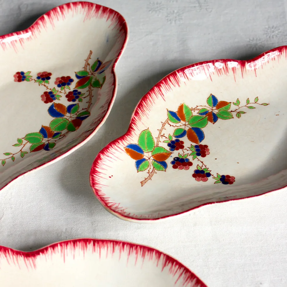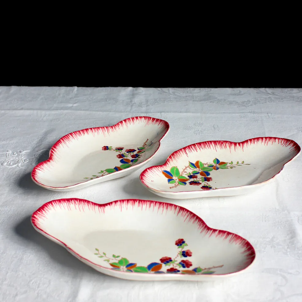 Trio de raviers de la série de Longwy intitulée « Automne » caractérisée par un décor en grappe asymétrique en relief et des bords peignés framboise.