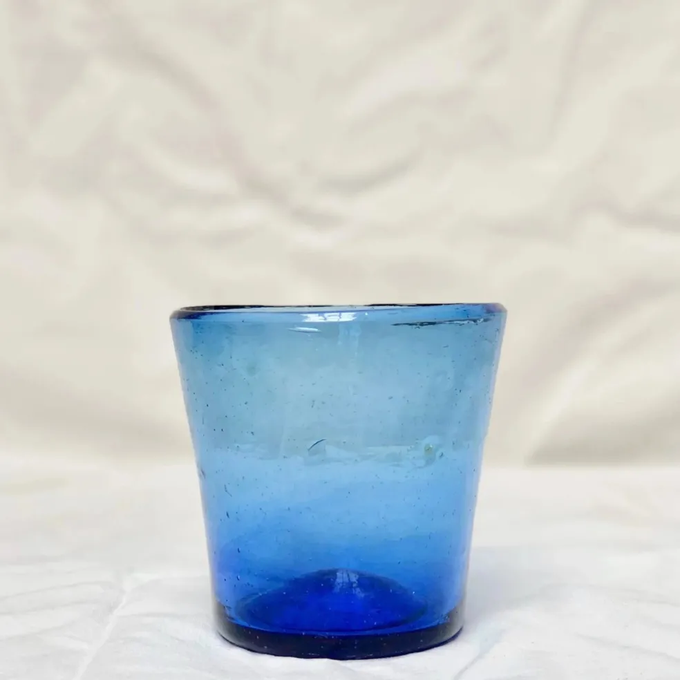 Verre à eau inspiré des petits bougeoirs familiaux. Résistant et légèrement évasé, il peut être utilisé pour les breuvages froids ou chauds. Son style moderne et intemporel permet de le mixer avec toutes les vaisselles. Entièrement en verre recyclé, soufflé à la bouche. Décliné en vert et en bleu.