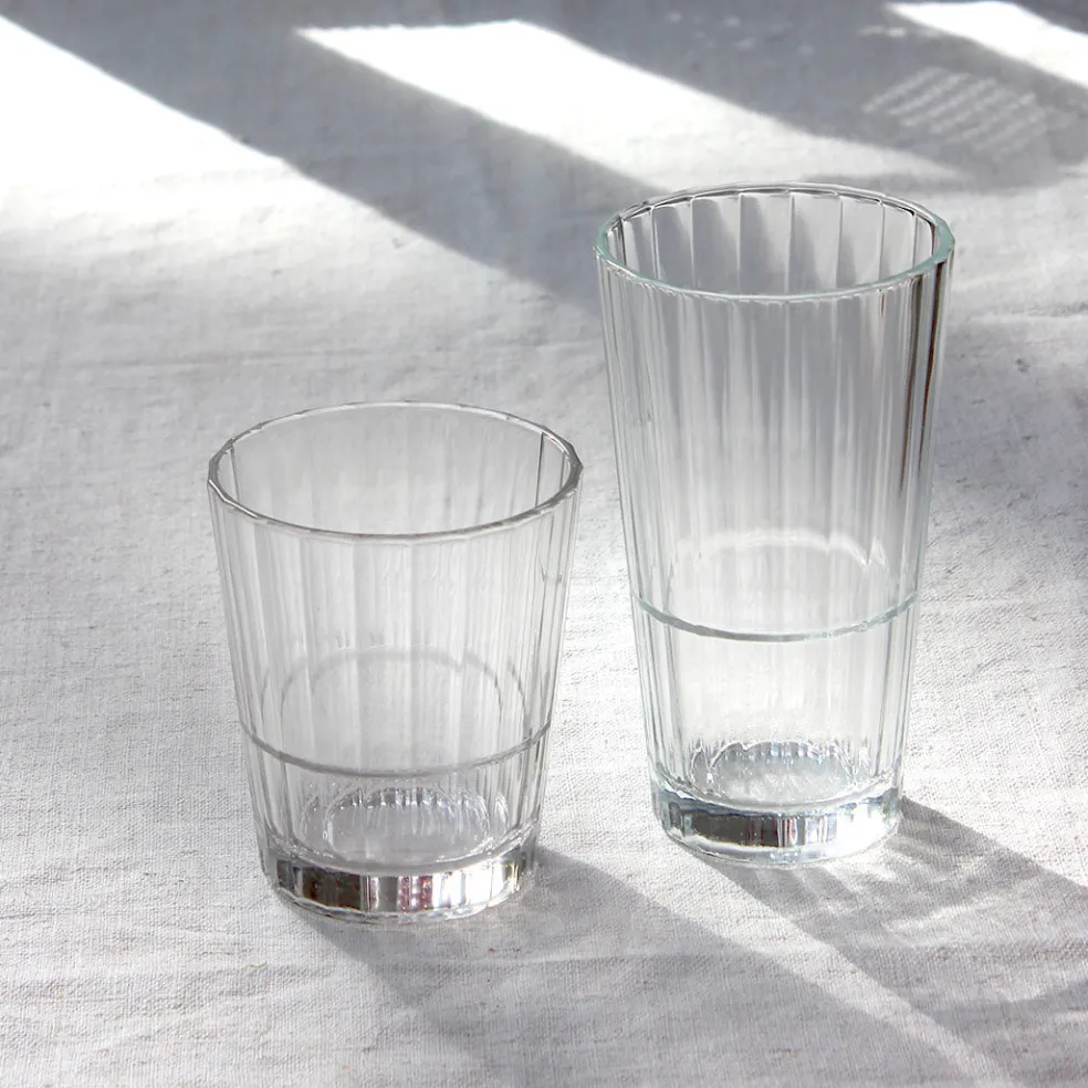 Verre gobelet strié aux lignes droites en verre transparent et résistant. Un modèle intemporel, empilable et compatible avec le lave-vaisselle. Décliné en forme basse et haute.